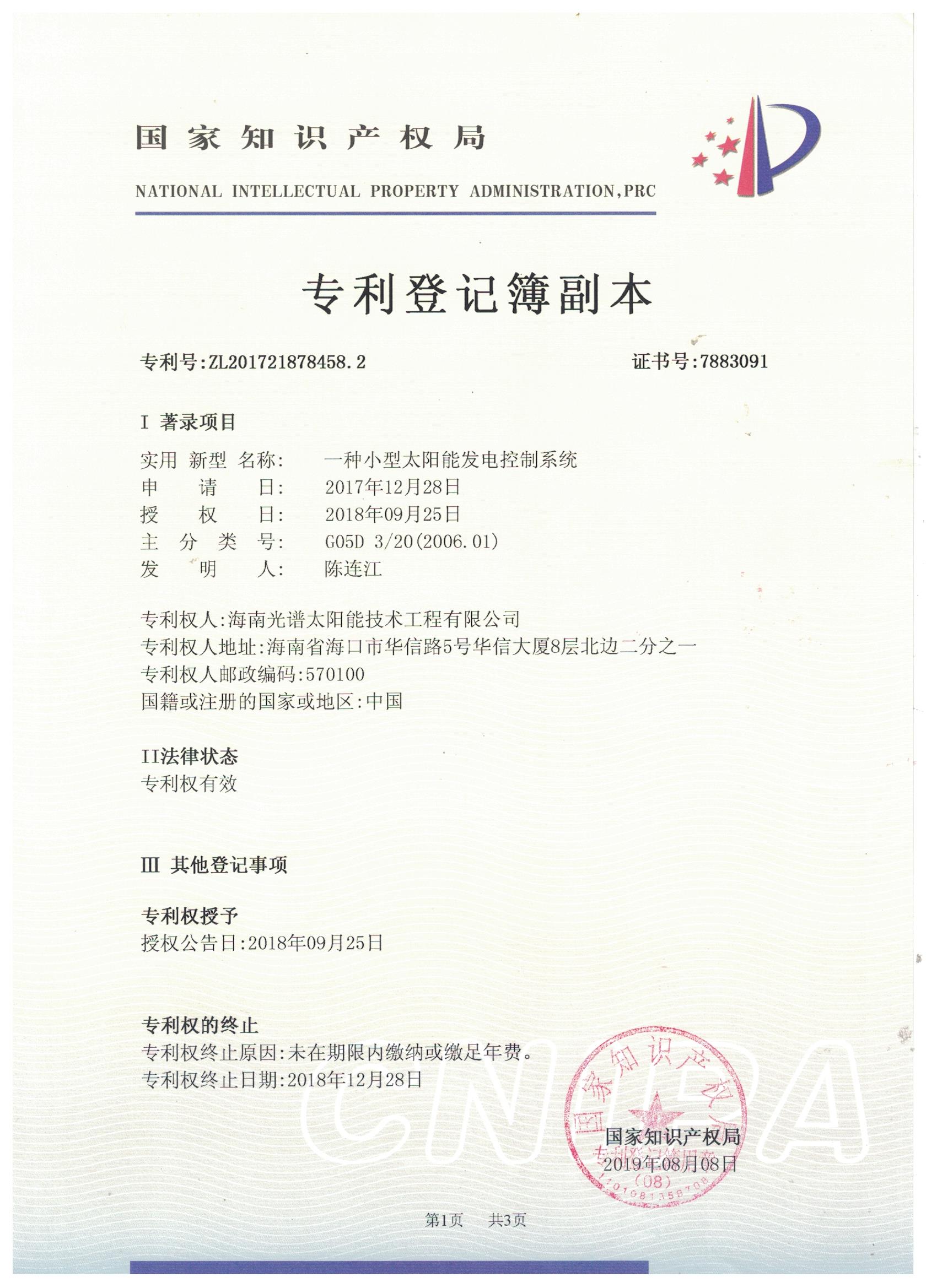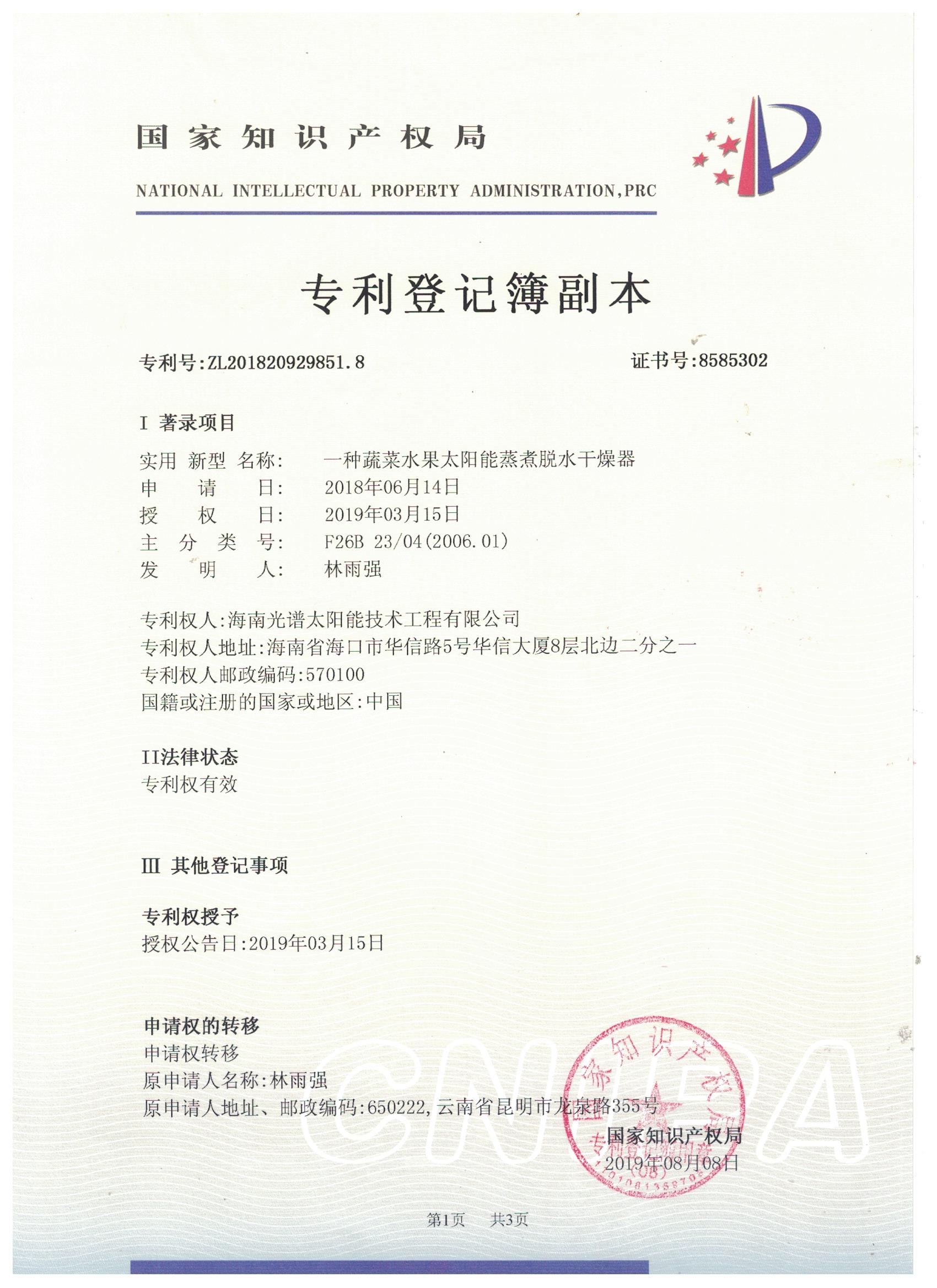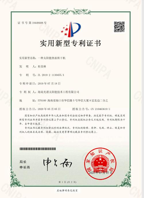 近日,我司申報的“一種太陽能熱泵蒸汽發(fā)生裝置”發(fā)明專利通過審查,獲得國家知識產(chǎn)權局授予的發(fā)明專利證書,授權專利號為“ZL201911126309.4”。 此次獲得國家頒發(fā)的專利證書,是對海南光譜公司創(chuàng)新實力的認可,代表著我司知識產(chǎn)權取得了突破性進展,為公司的持續(xù)性發(fā)展提供強有力的科技創(chuàng)...